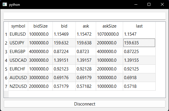 This task, when automated, can allow me to have a visual indicator as I am coding. There is a caveat. There is not really a need to create such a GUI application, as the IBKR Trader Workstation (TWS) has the ability to customize your windows to show specific functions, one of them being a live Forex ticker list.