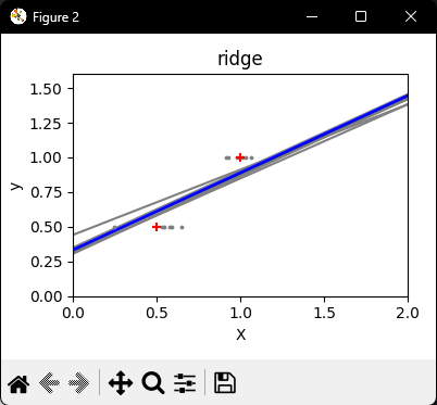 We sample only two data points, then repeatedly add small Gaussian noise to them and refit both OLS and Ridge. We plot each new line to see how much OLS can jump around, whereas Ridge remains more stable thanks to its penalty term.